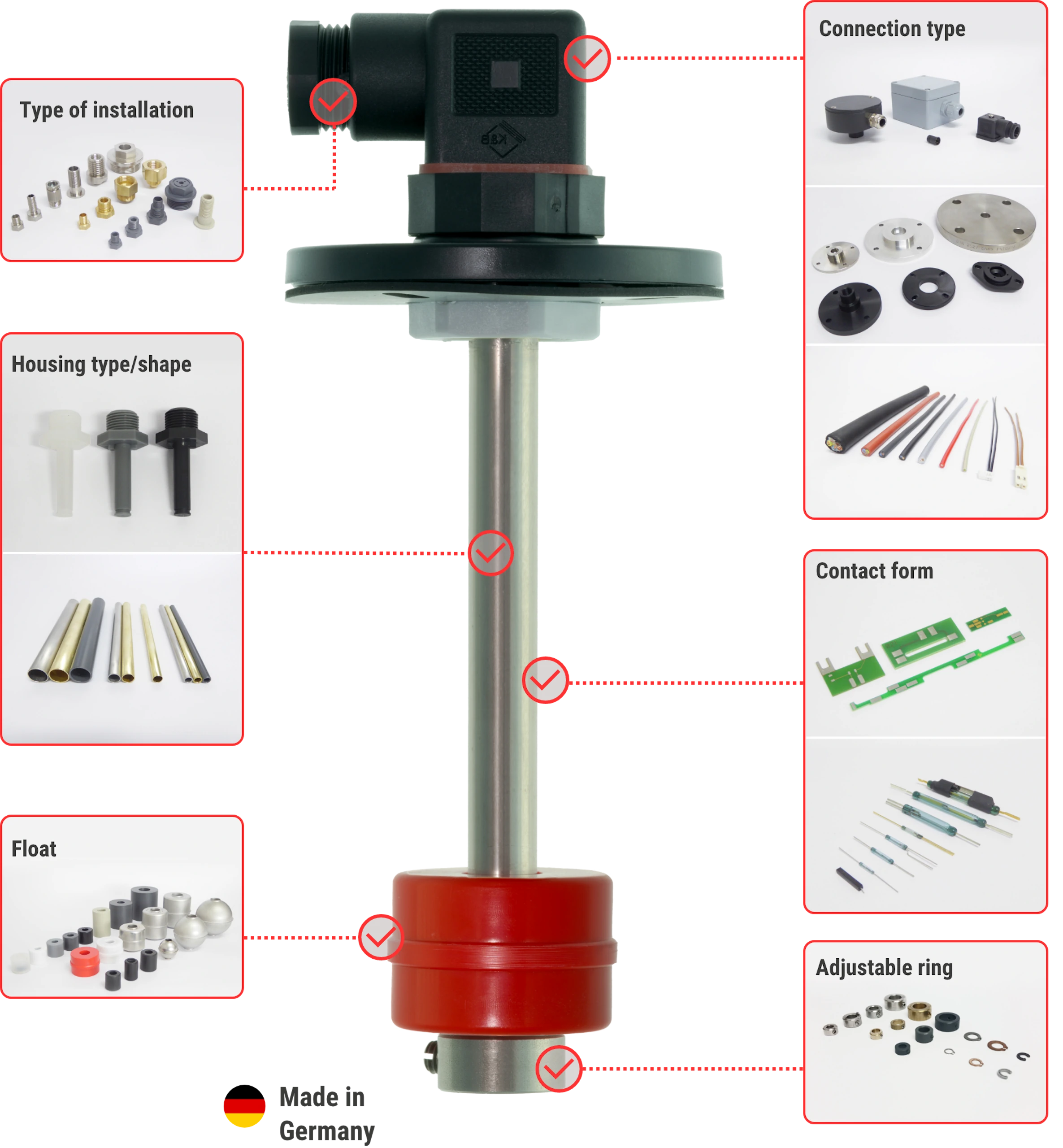 Whether installation position, material, contact form, or connection type – with our modular system, you can adapt every miniature float switch exactly to your requirements.